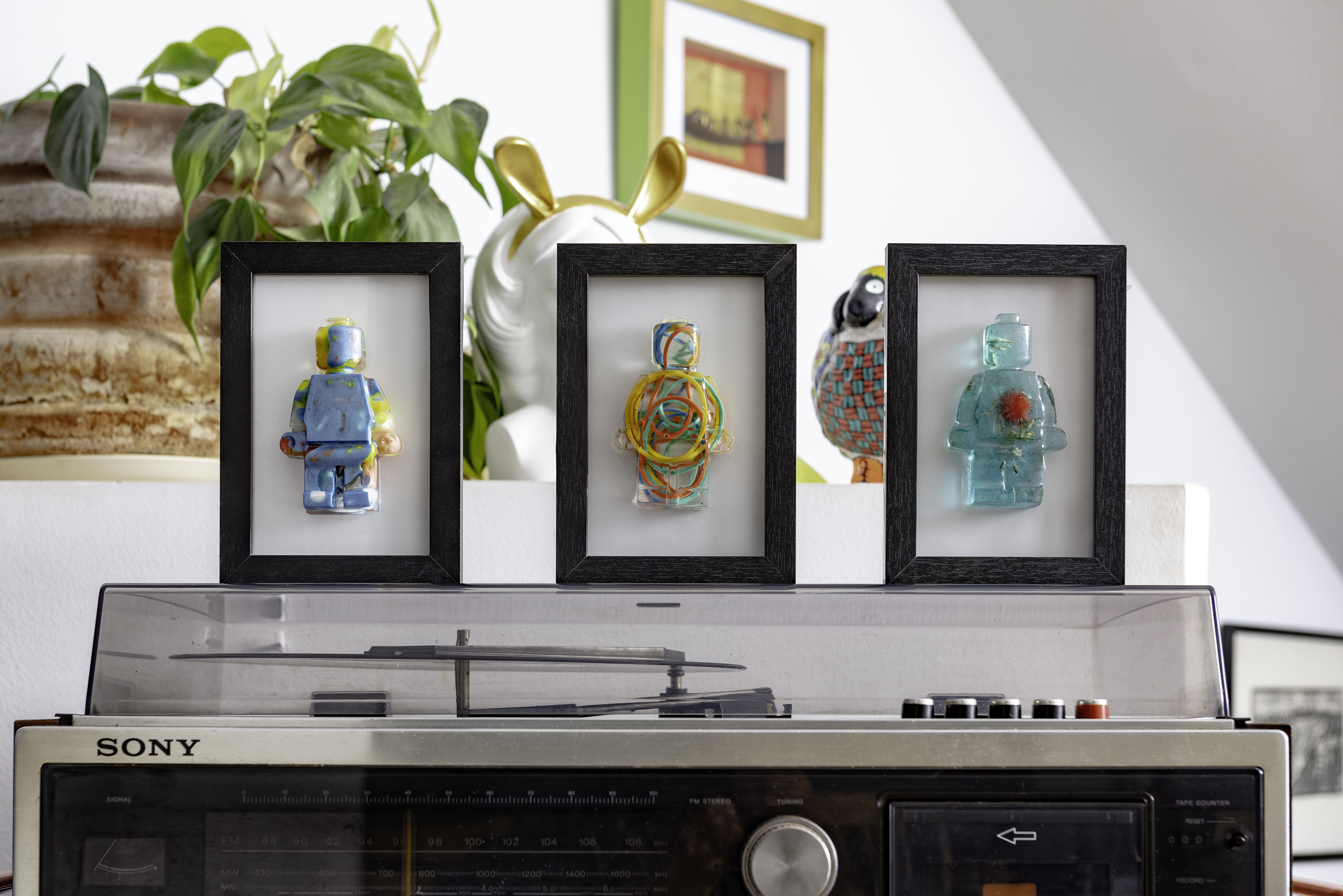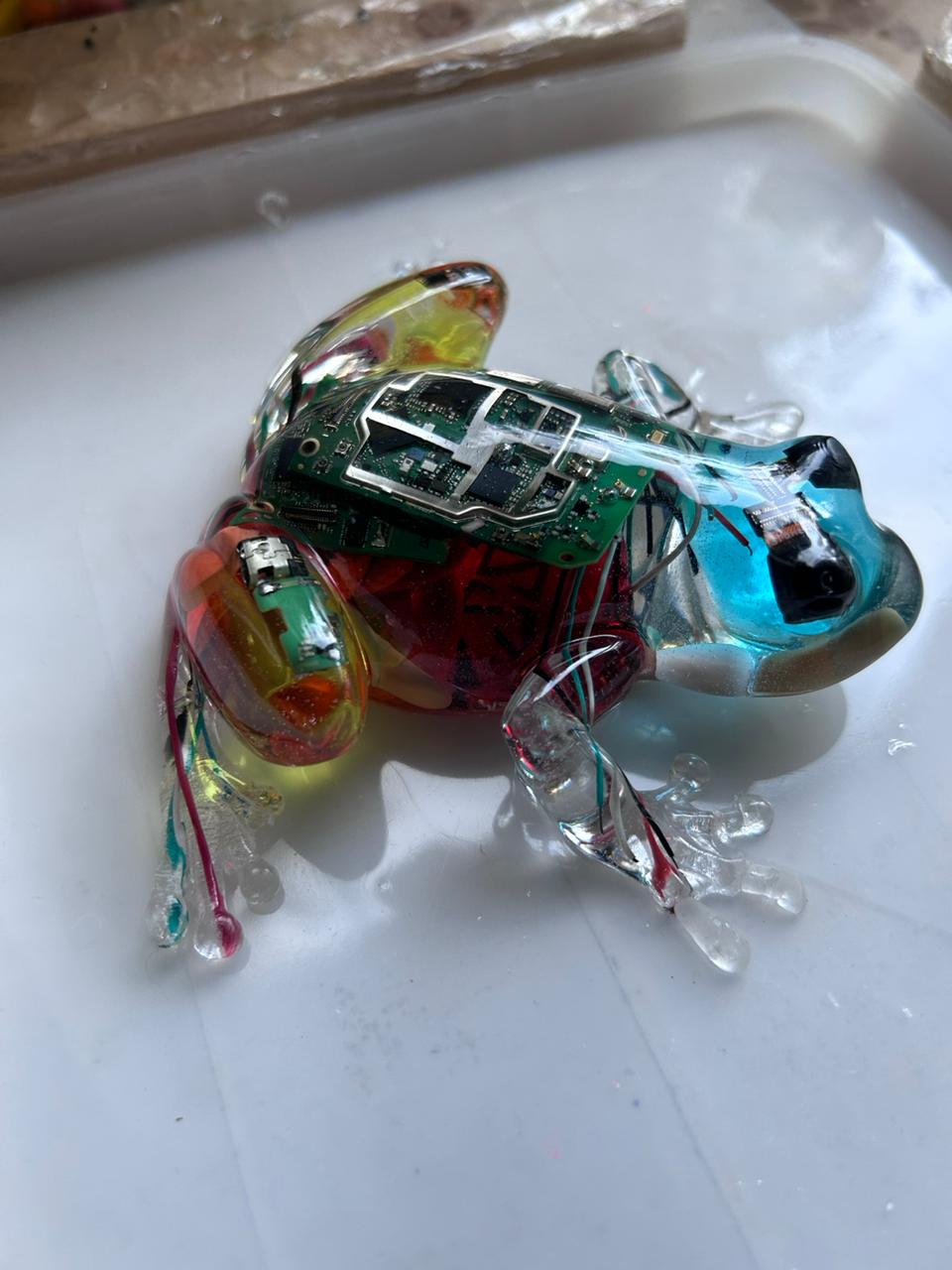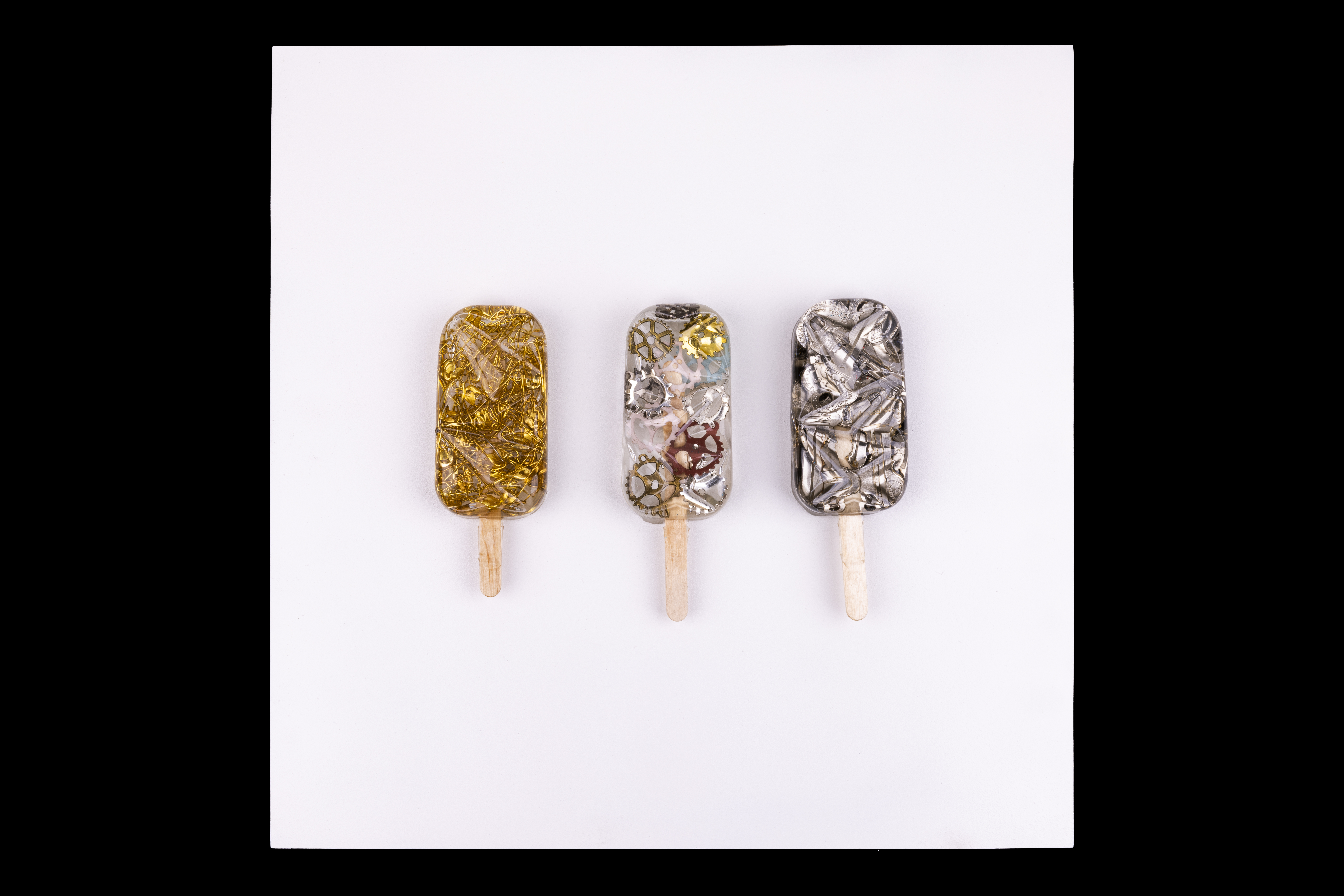 Creamos obras de resina en las que mayormente buscamos encapsular elementos que la gente desecha o que no usa, para congelarlas en el tiempo.
