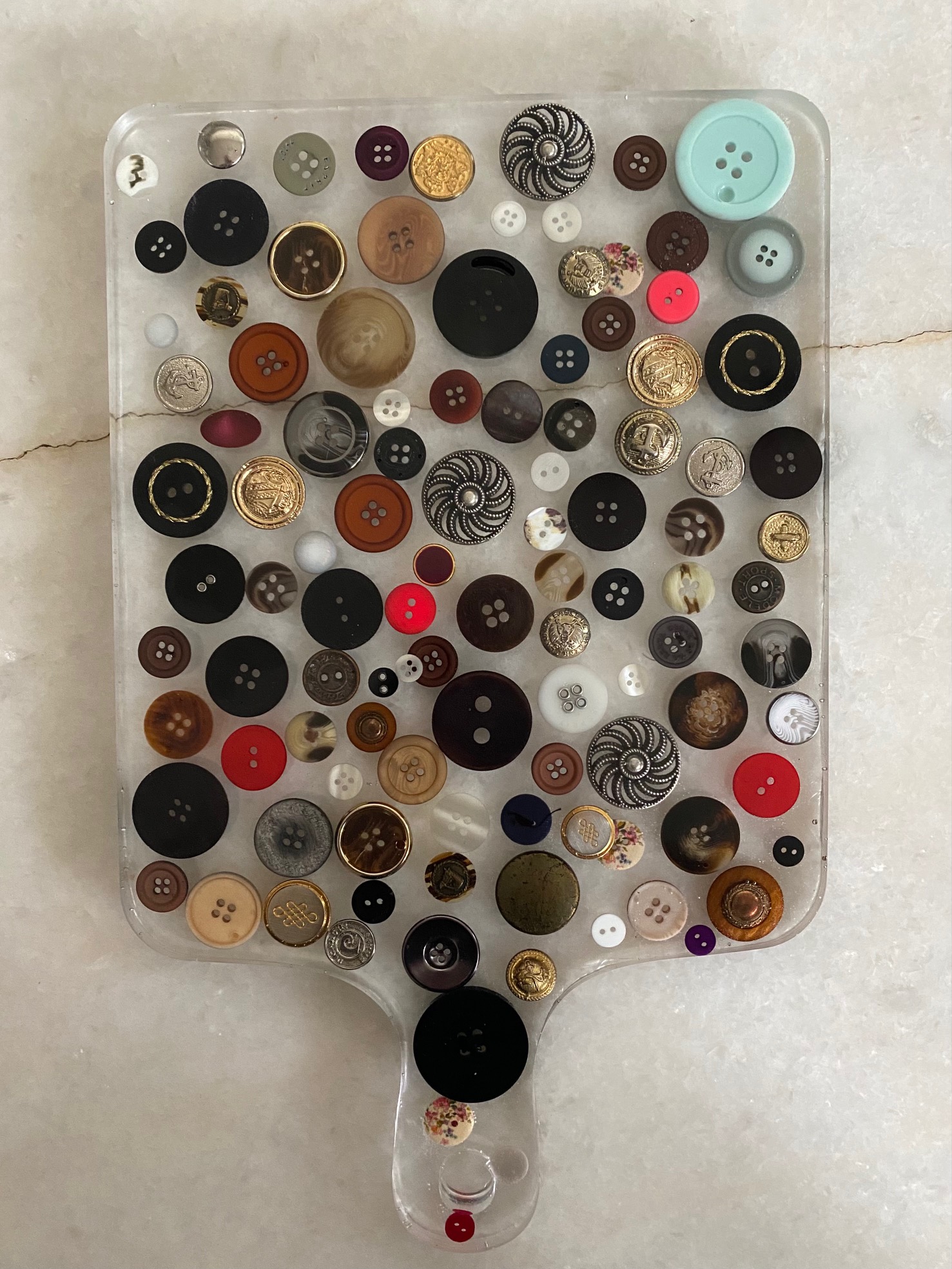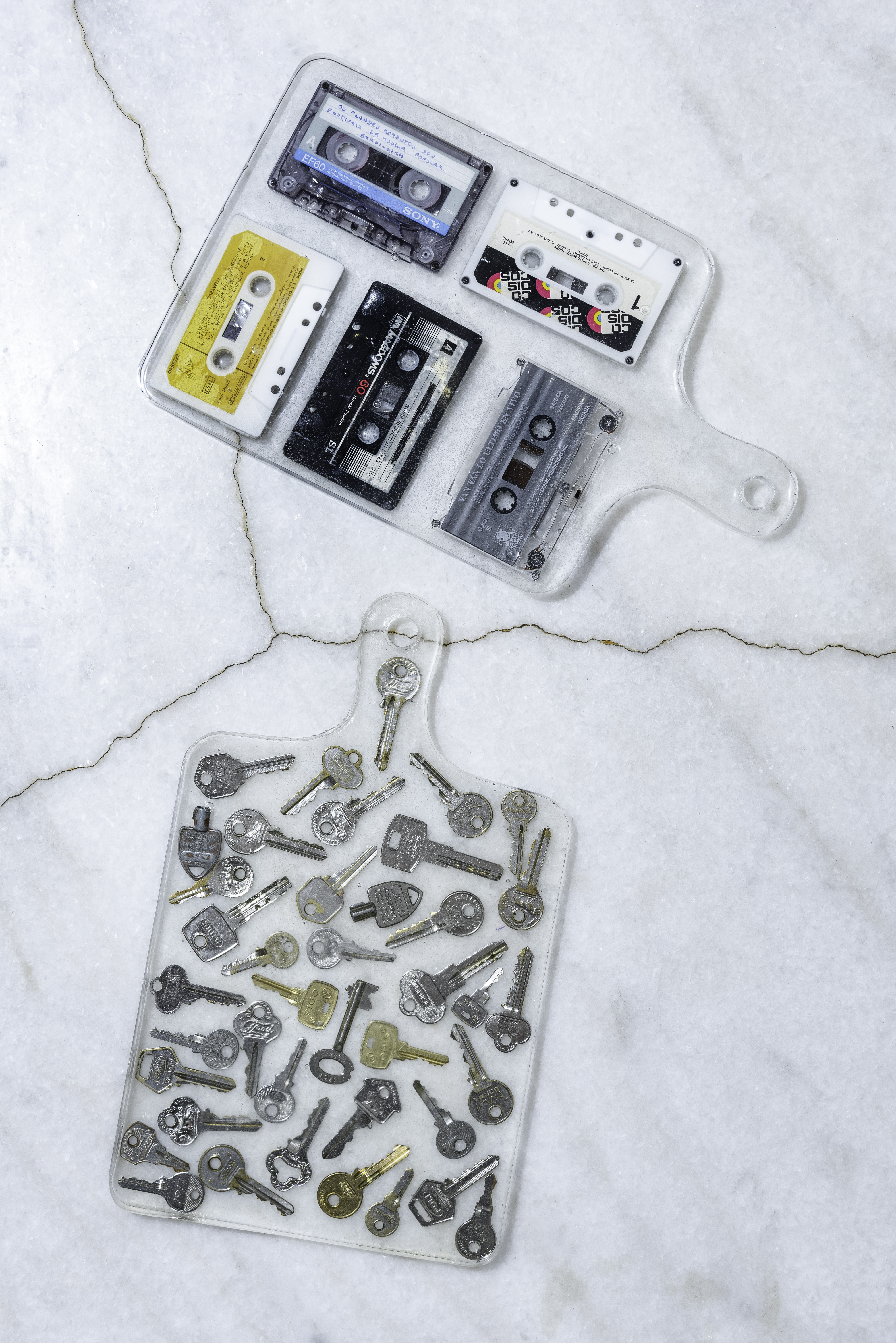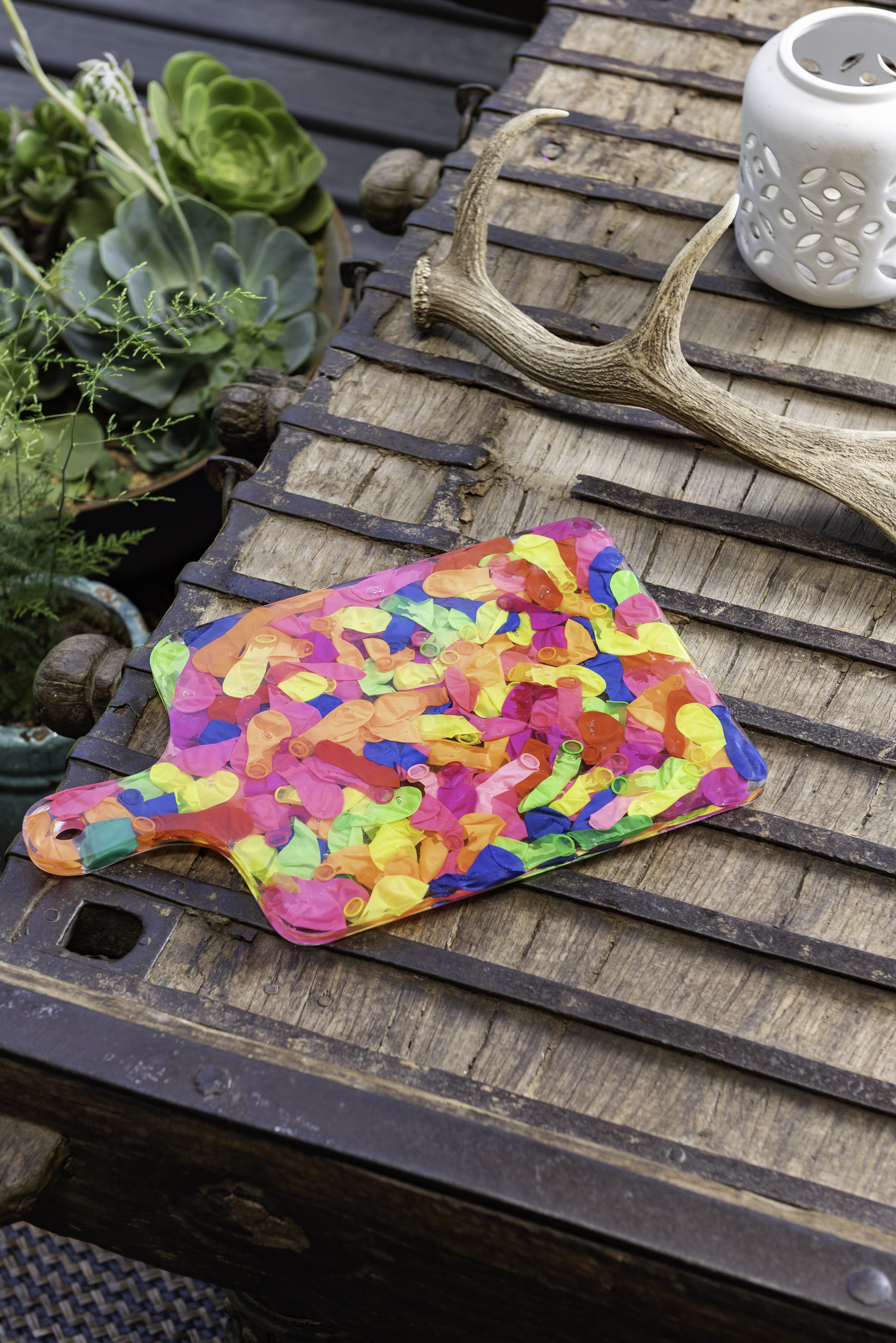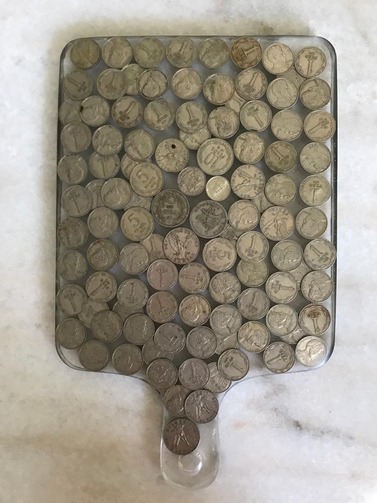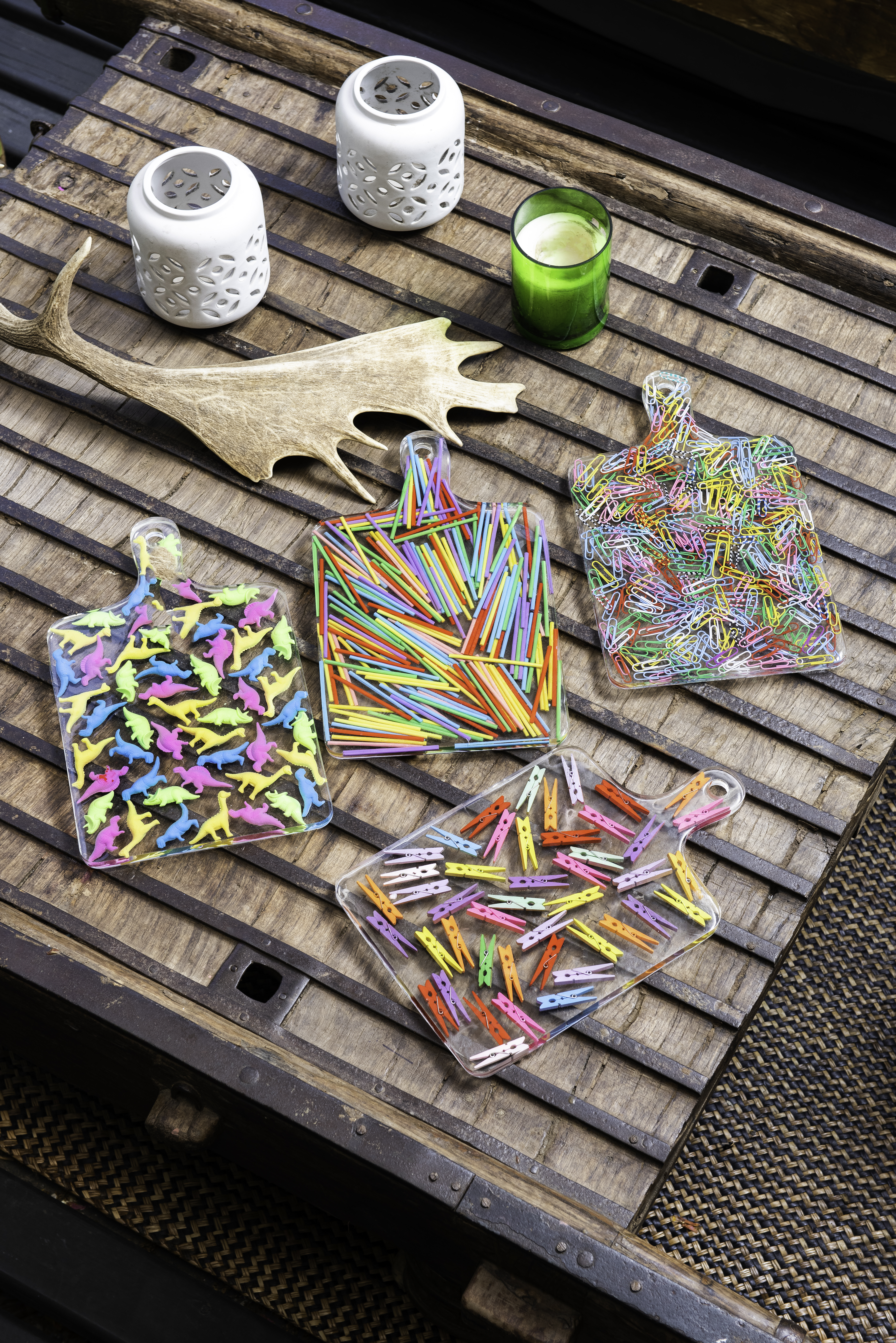 Las tablas pueden usarse como cualquier otro tipo de tabla, pero tambien puede usarse como decoración o adorno. Destacan en ellas los materiales usados como rellenos; tapas de botellas, corcho, dulces, llaves, envoltorios , etc. Estas piezas miden aproximadamente 33 cms de largo por 22 cms de ancho.
