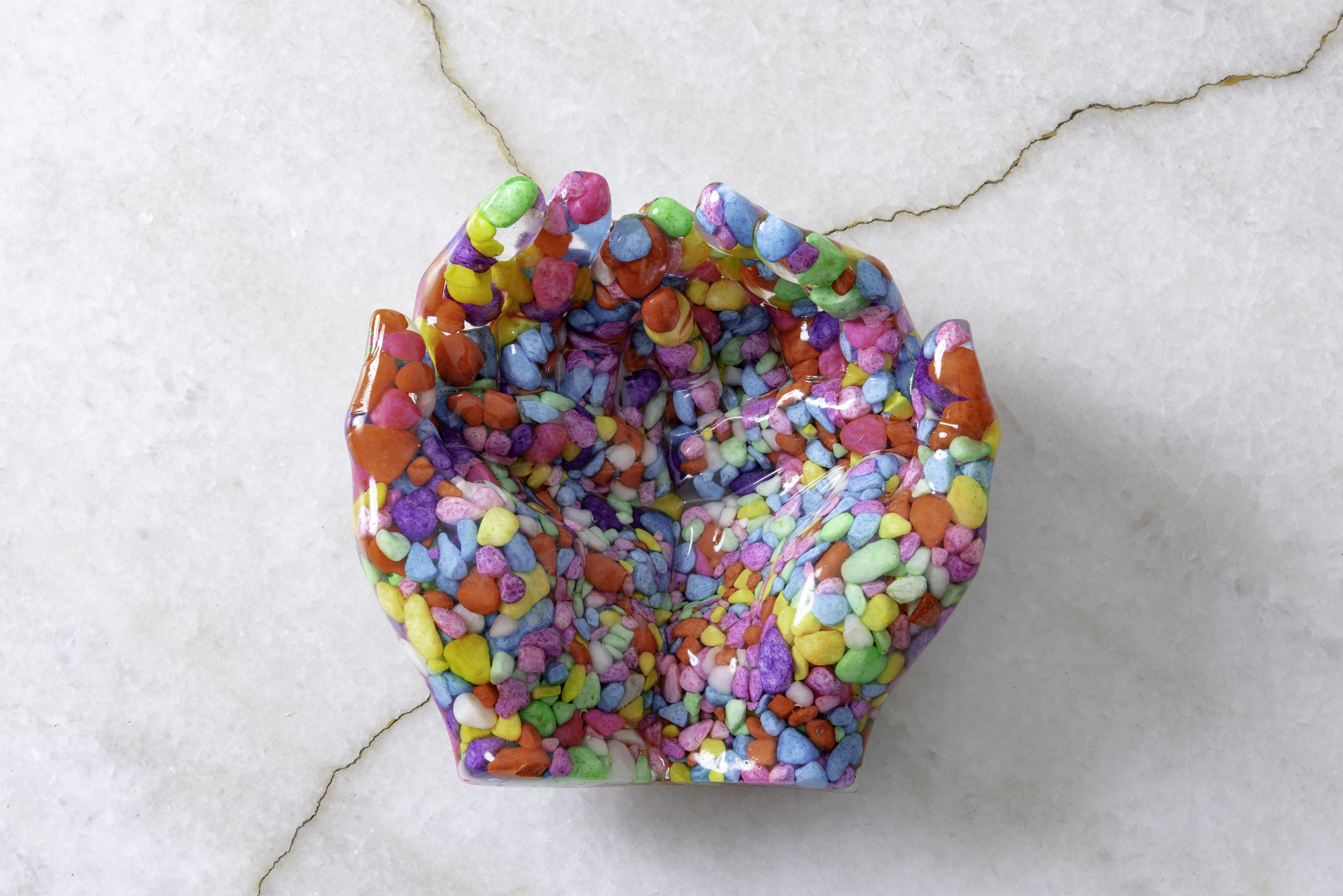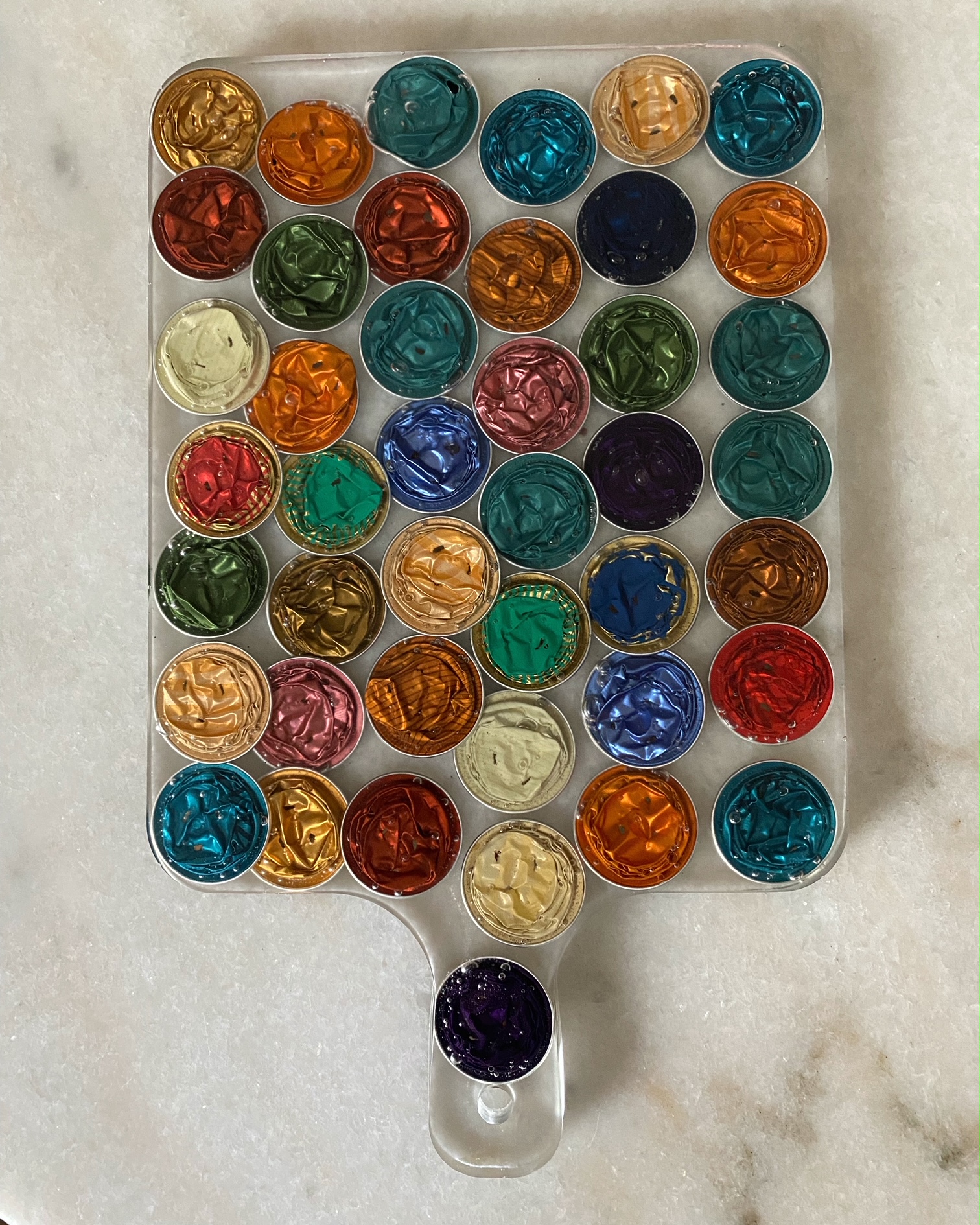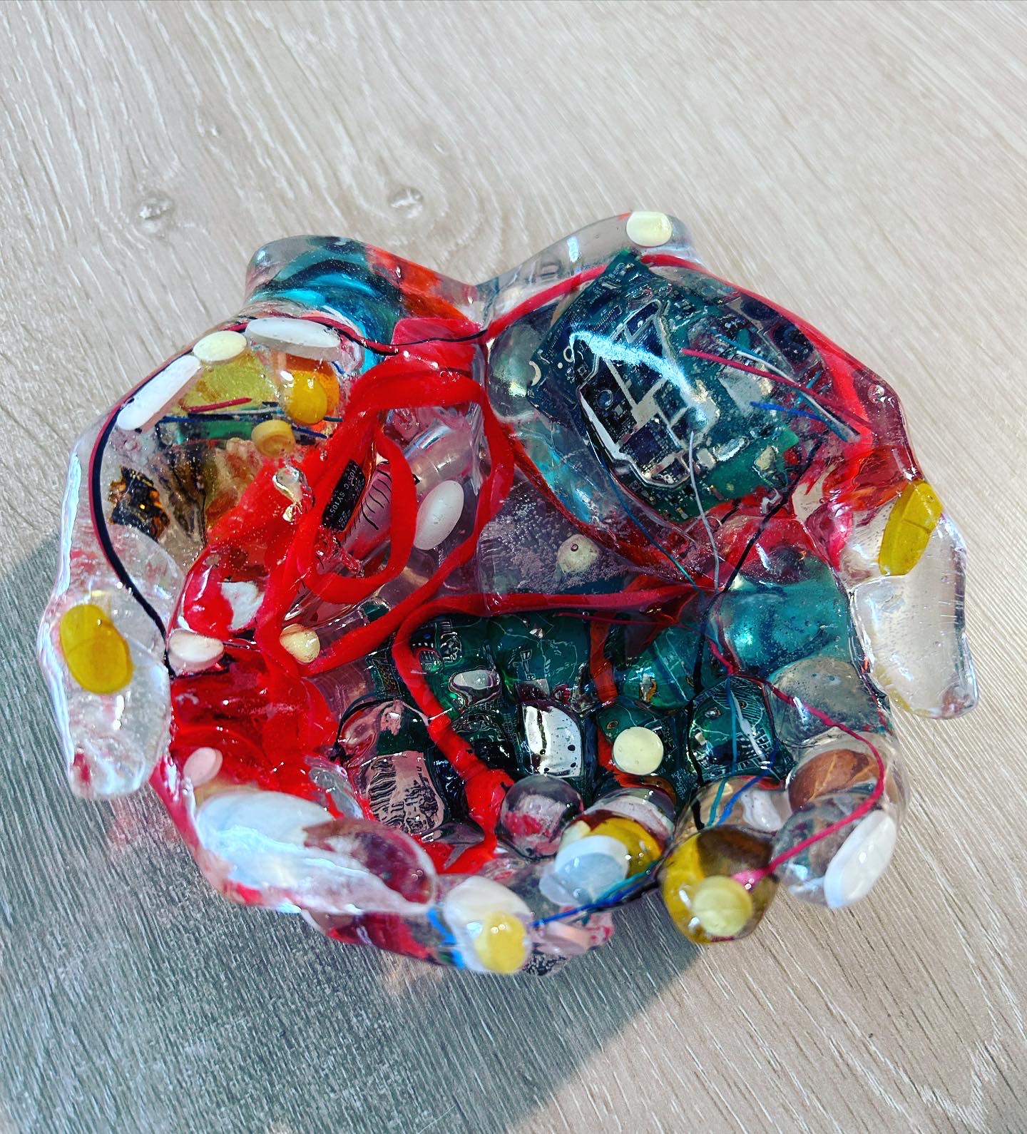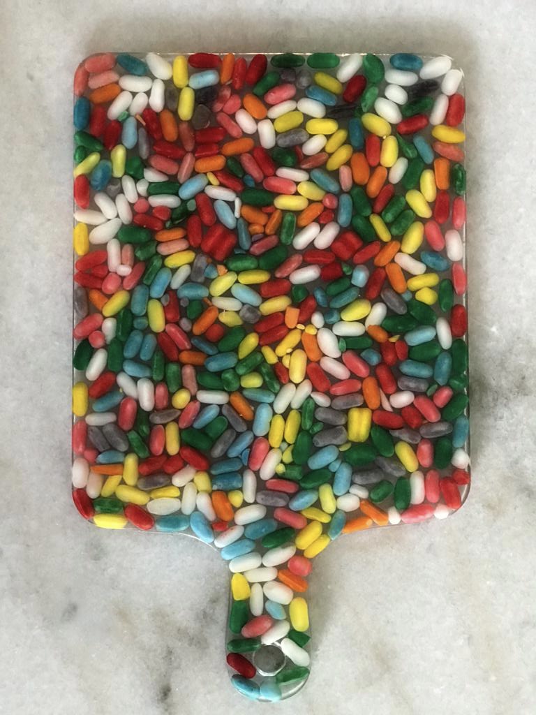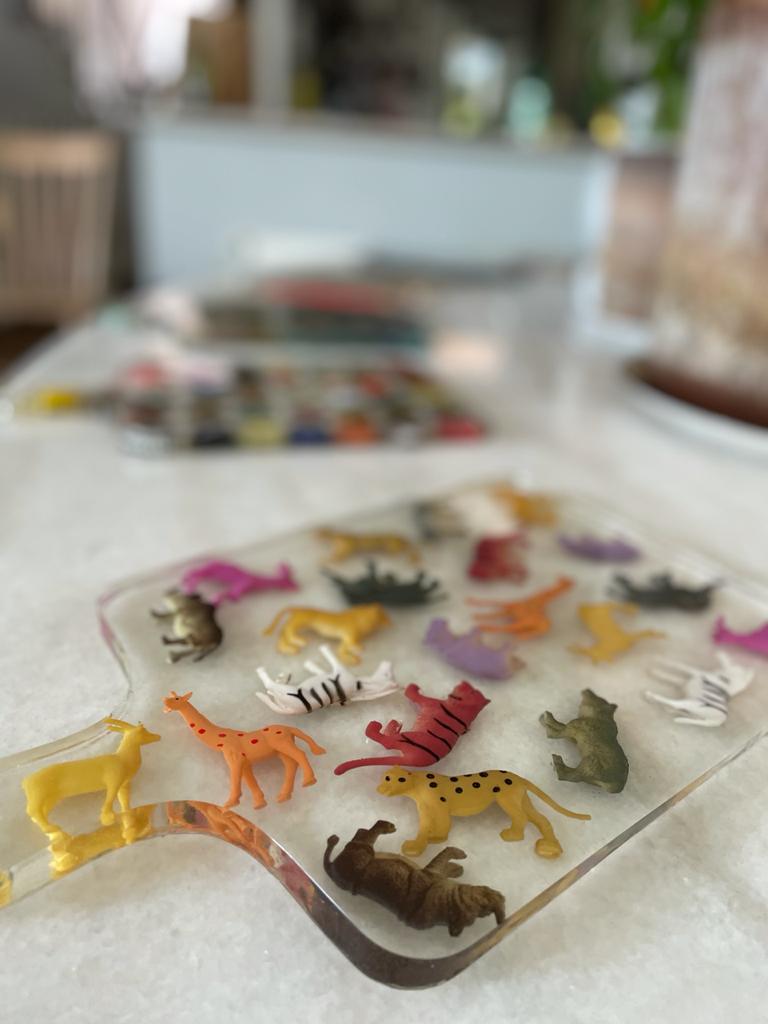 La resina que uso es libre de VOC y BPA por lo que una vez que el proceso de endurecimiento se lleva a cabo, la obra creada pasa a ser inerte, por lo que no hay problema que tenga contacto con alimentos.